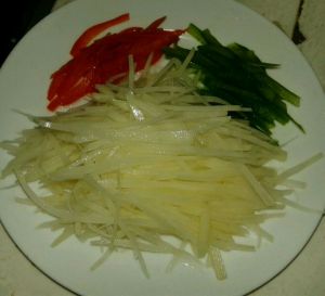 准备好材料。土豆切丝,泡冷水,青红椒切丝