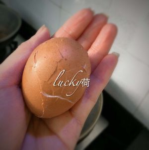 鸡蛋煮好后起锅用冷水冷却…用两个鸡蛋在手中对敲,把鸡蛋壳敲碎但不要剥掉鸡蛋壳