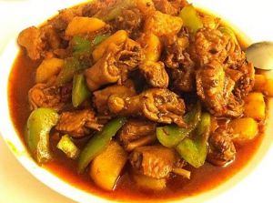 先锅里放油。。把土豆扔下去煎一下。差不多黄黄的时候捞出来。因为我们喜欢吃软软酥酥的那种。 然后放入糖。等糖煮的颜色变成红褐色。把葱姜放下去炒出香味。再把鸡块放下去。炒匀、加生抽。豆瓣酱和蒜。继续炒匀。