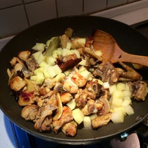 加入洋葱翻炒,然后加啤酒没过鸡肉,然后加入土豆,少许盐和酱油