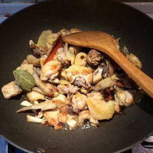糖花开,下鸡块。翻炒至金黄,加入葱姜蒜,酱油,料酒,盐等。