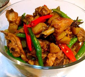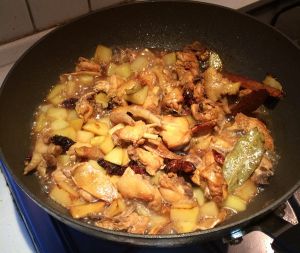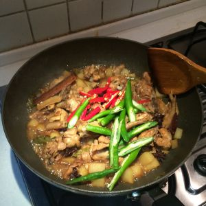 翻炒。后土豆,青椒,干辣椒,花椒,大料。糖。水。炖