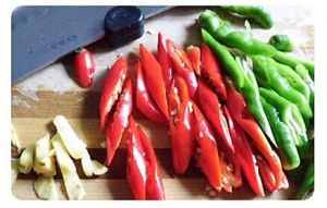 倒入啤酒烧开后,放入准备好的青红辣椒一起炒。