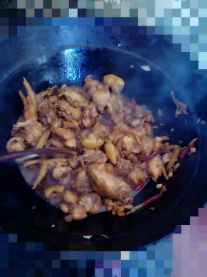 锅热之后放油,油开后放入姜,蒜,八角,辣椒,之后放入鸡肉酱油,进行翻炒,炒出金黄色后加入白糖,鸡精,盐后翻炒1分钟