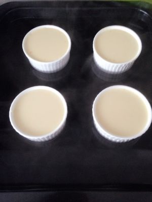 布丁放在烤盘上 往烤盘里注入模具一半偏低的份量的热水 最好是80度的