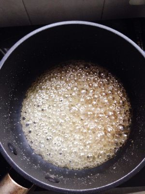 当糖全部融化颜色成琥珀色时关火 因为还有余温所以最终的颜色是琥珀偏深 喜欢苦的可以熬至深琥珀色 喜甜的可以在近琥珀色时关火 这里最需要注意的是余温 应当在接近自己想要的颜色时关火 余温会帮你得到那个颜色
