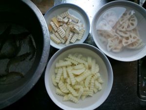 把土豆片放到水里面焯一下备用。再把鱼丸 牛肉丸 腊肠 木耳 宽粉 焯一下。宽粉要多煮一会儿。 圆生菜和绿豆芽我喜欢脆的 如果喜欢软的也可以焯一下