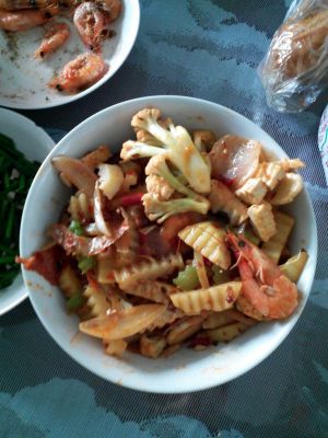先放入大虾翻炒,变色后放入烤肠翻炒