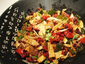 锅中留底油,放入干花椒、干辣椒和干橘子皮炒香