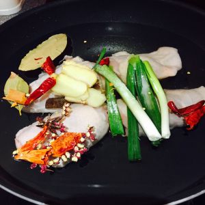 鸡肉冷水入锅,放上葱,姜,花椒,辣椒,八角,桂皮,香叶,煮10分钟然后盖上锅盖焖一会儿