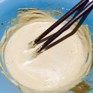 麻酱里放入盐和鸡精,加入凉水慢慢搅拌至顺滑