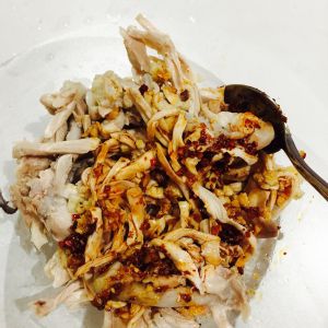 把鸡肉手撕成小条,放上盐,糖,蒜末,小勺酱油小勺醋,1勺花椒油辣椒油,1点香油,搅拌待用