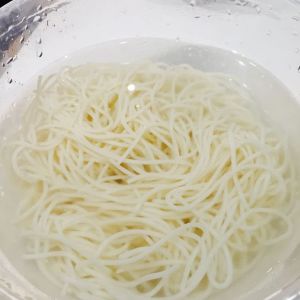 面条煮熟捞出,用冷却的熟菜油给其搅拌,防止粘连,用筷子或者手不停的抖动,让其快速冷却,盛盘