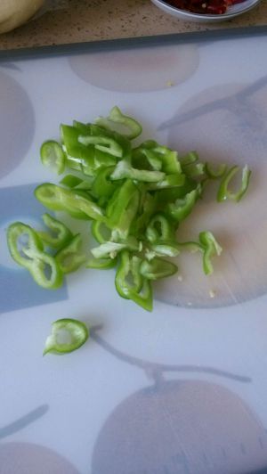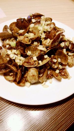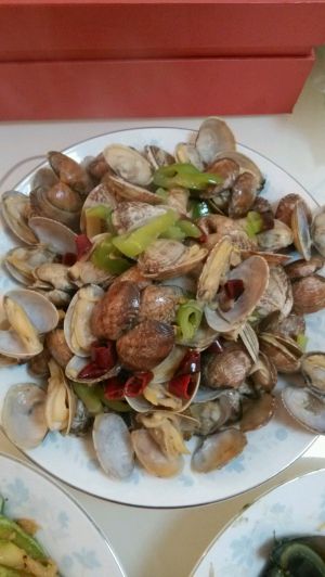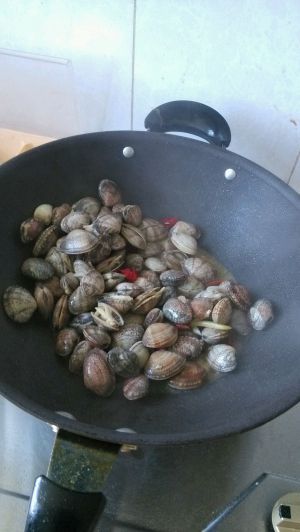 锅热后将葱姜蒜和干椒下锅爆香,倒入沥干水的花蛤,煸炒一会等花蛤慢慢开全口后,放入青椒,煸炒一下,加盐,鸡精少许。