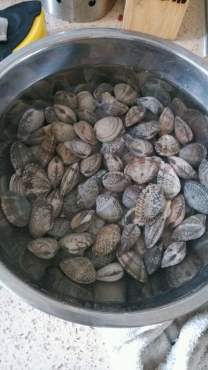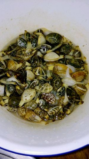 用盐水泡了2个小时,可以上面盖盖,吐沙子更快,然后清水冲洗5次,直到没有泥土!
