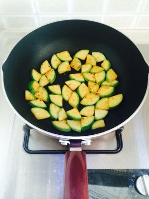 锅里放少许油,油热后西葫芦稍微煎一下,煎到两面发黄就可以了。这个菜建议用不粘锅做,这样很少的油就可以把西葫芦煎好。