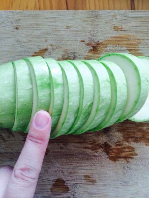 西葫芦切的稍微厚一点,像这样差不多一指宽,吃起来口感好。