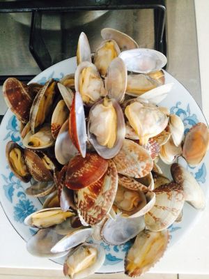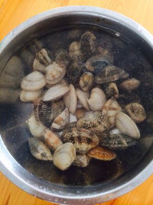 买回来清洗干净,放入清水里,放盐浸泡。最好下午买,沙子已经吐的差不多了。