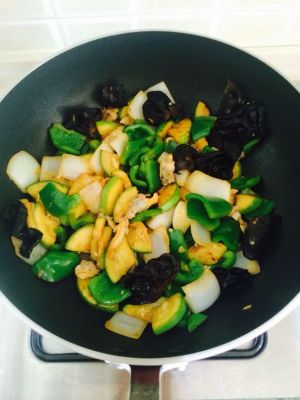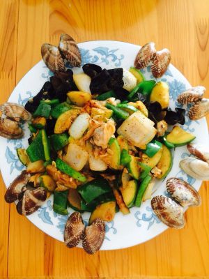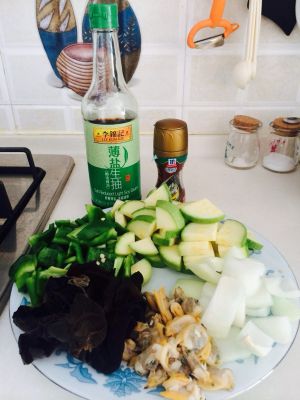 西葫芦煎好后依次放入洋葱、木耳、青椒、花蛤肉进行煸炒。洋葱可以炒一会,这样甜味释放的更多。青椒稍微一炒就可以,脆脆的口感更好。出锅前喷上一些淡酱油就可以了。这道菜不需要加盐了,因为花蛤和酱油都是咸的。