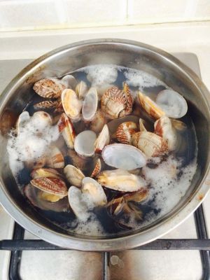花蛤吐完沙搓洗干净放水里煮。凉水下锅,水沸后花蛤壳打开就表示熟了。煮的时候可以看着,挺有意思的,水一沸花蛤就一个个的开壳了。砰砰砰的响,这响声就是“鲜”啊