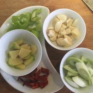 一头蒜,拍碎切开,葱姜辣椒切好备用。