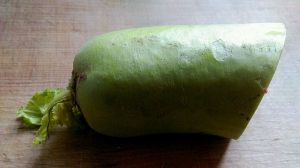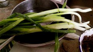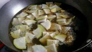 摸软入汤后加盐和味精,放入蒜苗后起锅。