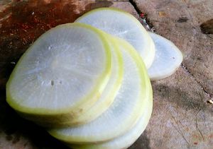 舀适量羊肉汤入锅,放入切好的白萝卜片,黑木耳丝烧开;