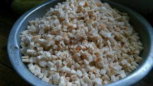 做好后差不多这么厚,把馍掰成比指头蛋小的小丁放碗里待用。(几个人掰几碗,因为得一碗一碗的做)