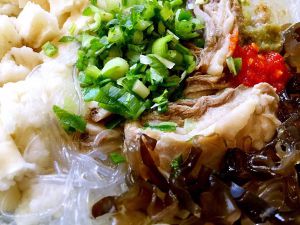 炖肉的空档把需要的葱末、香菜末、粉条、黄花、木耳和糖蒜、辣子酱准备好。