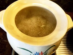 锅里汤烧开了,加入切好的肉。因为汤里有盐,所以是不用再放盐的,如果觉得盐味不够,可以适当加点。