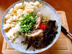 另外起锅把刚烧好的汤加入锅中,可以根据个人口味选择汤的量。放入掰好的馍,煮2分钟后加入木耳于粉丝。