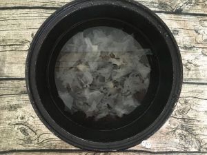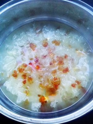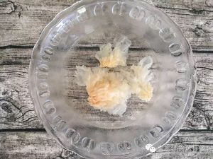 将银耳和冰糖放入锅中,加入适量纯净水,隔水慢炖三个小时,将银耳炖出胶质。