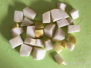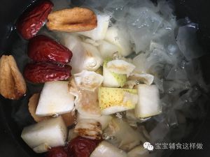 银耳炖到汤汁稍有粘稠,倒入梨块,继续炖15分钟。