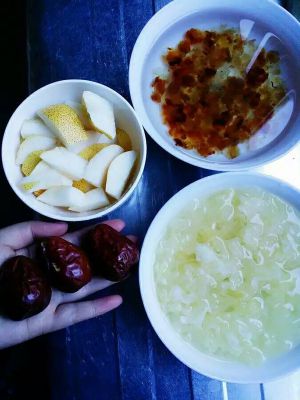 准备好食材:削好的梨要把核去干净。银耳适量发泡好。