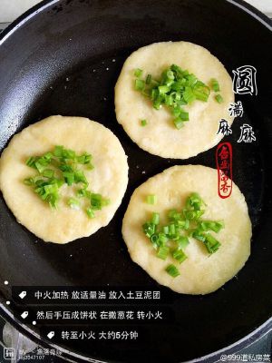 中火加热 放适量油 放入土豆泥团 然后手压成饼状 再撒葱花 转小火 转至小火 大约5分钟