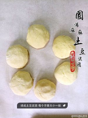 做锅上油,油温不能太高,以放一点点土豆泥起泡为宜,中火定形后大火把表皮炸成金黄,即可出锅