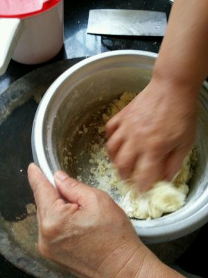 第二步,将蒸熟的土豆压成土豆泥,加入准备好的配料,及盐、面粉和鸡蛋,搅拌均匀