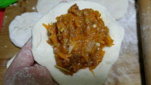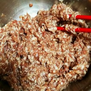 牛肉馅撒花椒粉,倒两大匙酱油,盐,适量水搅打上劲,和面,面要和软一些