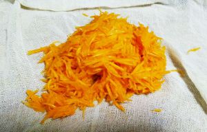 南瓜擦丝,撒一点点盐,杀出水,用屜布把水拧出