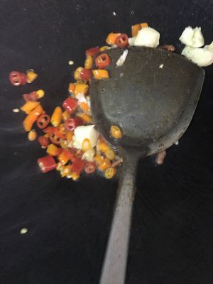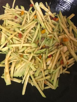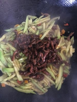 倒入爆炒过的牛肉丝一起混炒 加黑胡椒味精即可出锅.