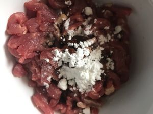 牛肉切丝后 加少许盐 、老抽(一勺左右,上色)淀粉 搅匀腌制5分钟左右.