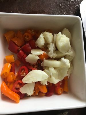 先准备沙拉酱汁的食材,洋葱和蒜切末。(家里有沙拉酱的可省略这步直接用沙拉酱,不过这个酱挺好吃的)。