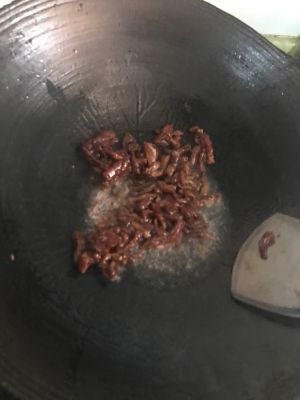 锅烧热 给油 油热后倒入牛肉丝爆炒30秒 起锅.