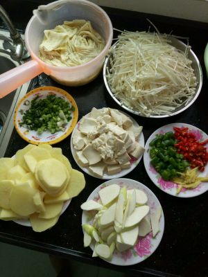 豆芽、西葫芦切片垫底,千张等一些配菜平铺,把烧开的料汁倒进来。