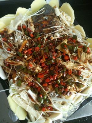 把烤好的烤鱼放到烧开的配菜上面,锅里可以根据自己口味,放一些辣椒酱、蚝油、冰糖、花椒等,喜欢重口的可以再放一些干辣椒。
