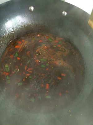 取出鱼,将剩下的油继续利用,加入火锅料,少许豆瓣酱(一定要少否则会很咸)翻炒,加入葱段,蒜继续翻炒,加入辣椒,花椒,待炒差不多时中间适当加入少量水。)