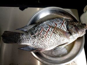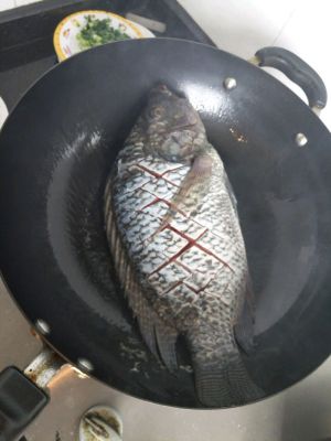 罗非鱼一条,洗干净,摸点盐在鱼身上,再淋上料酒,腌制一个小时