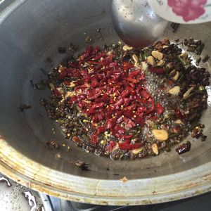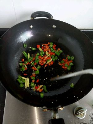 锅里下油,倒入姜、辣椒爆香