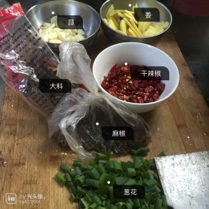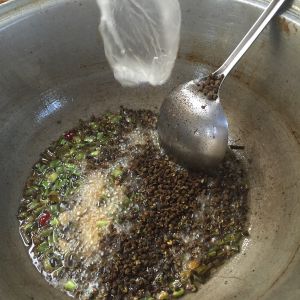 油热后 依次放入葱花 蒜片 麻椒和花椒炒香