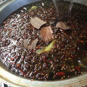 锅里放2大勺郫县豆瓣酱、一块火锅底料、2勺牛肉辣酱,2勺生抽炒香,放一把花椒,放适量水烧开。如图